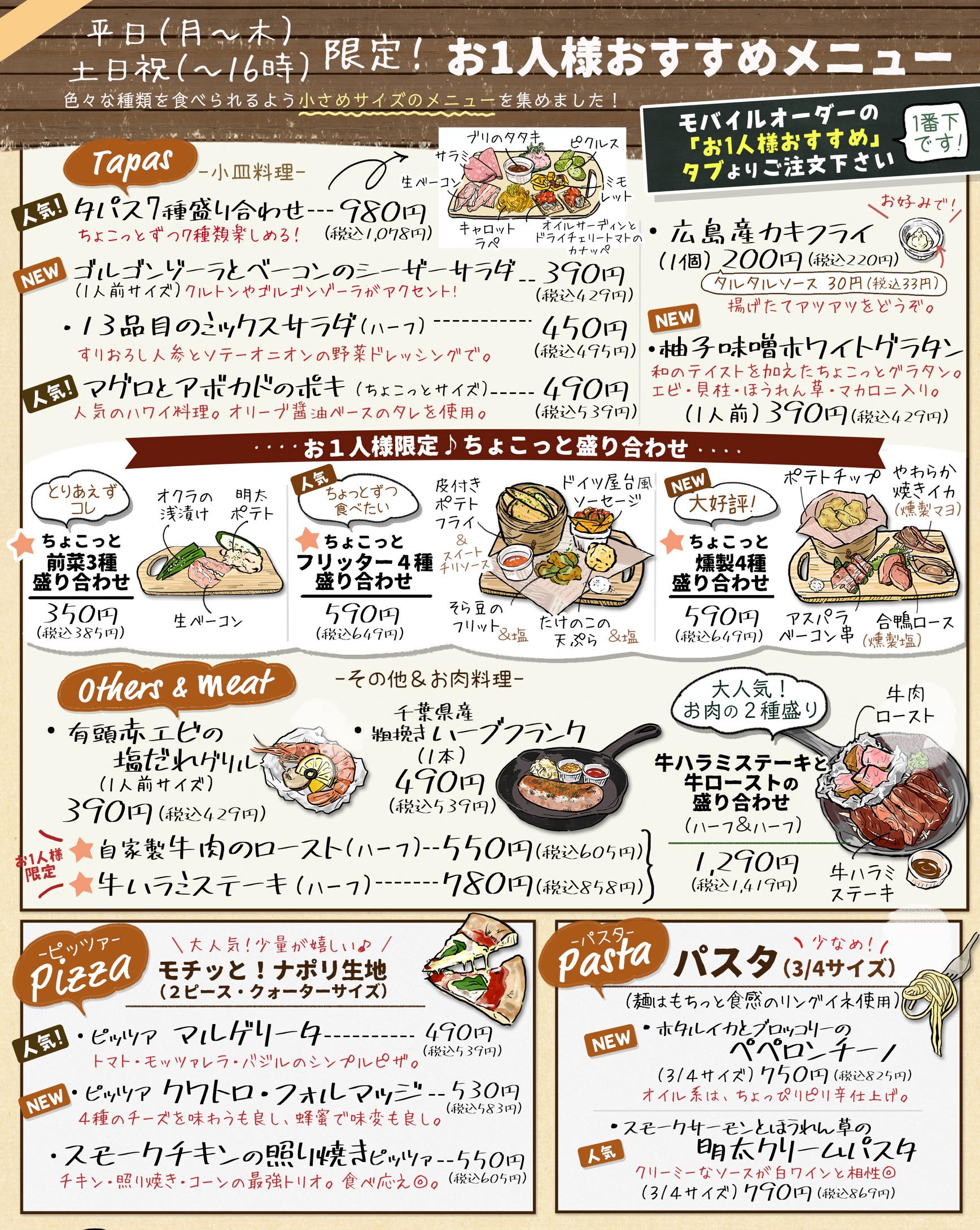 (お1人様限定メニューは、平日(月〜木)と、土日祝のお昼(〜16時まで)の限定メニューです)